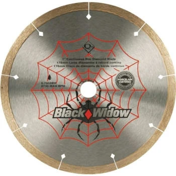 - The Black Widow 6-7008BW 7 in. Micro-Segmented Diamond Blade is a premier blade for fast, chip-and wobble-free cutting of porcelain, marble, granite and ceramic tile. Use for wet cutting. The unique micro-segmented laser cutouts around the perimeter keep the blade cooler for superior performance and a longer life. Independent testing has shown that Black Widow specialty blades continuously out perform the competition in durability for a longer life and speed of cut, reducing project time. Blade specifications: 7 mm Rim Height; 5/8 Arbor Size; 8730 Maximum RPM.